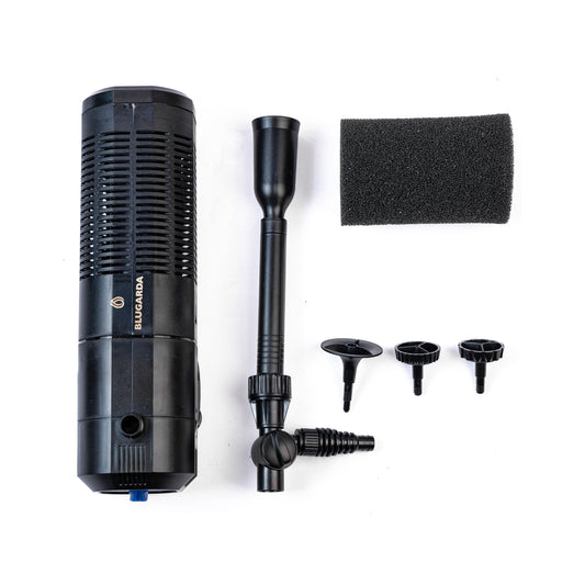 Der BluFilter ist ein All-in-One-Set zum Filtern und Reinigen von Teichwasser. Das Filtersystem verfügt über eingebautes Filtermaterial, eine eingebaute Pumpe, eine eingebaute UV-C-Lampe und ein optionales Fontänenset. Sie müssen keine zusätzliche Teichpumpe, Springbrunnen oder UV-C-Lampe kaufen, damit das Set funktioniert. Dies macht es zu einer kostengünstigen All-in-One-Lösung für Ihren Teich.