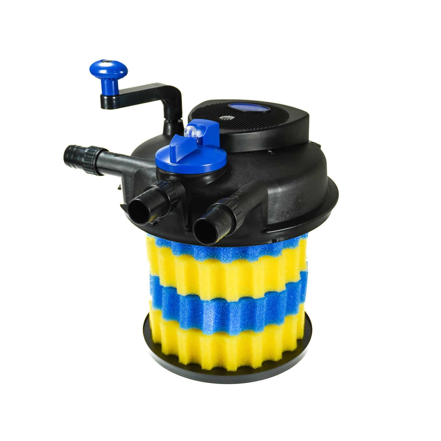 Mit zwei verschiedenen Arten von Schwammfiltern werden Schmutzpartikel eingefangen und Schadstoffe abgebaut. Im Laufe der Zeit entwickelt sich im Schwamm ein biologischer Filter aus verschiedenen Mikroorganismen. Diese bauen schädliches Ammoniak und Nitrit zu Nitrat ab. Nitrat ist eine wichtige Nahrungsquelle für Ihre Teichpflanzen.
